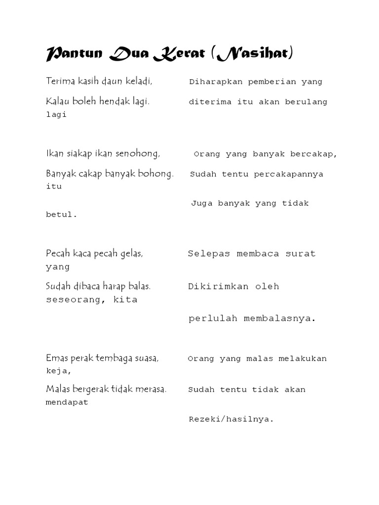 Kuning emas masaknya padi mawar merah dalam jambangan terima kasih daun keladi budi tuan jadi kenangan. .terima kasih daun keladi budi tuan jadi kenangan buat bangsal di pulau daik menahan taut sambil mengilau kalau asal benih yang baik jatuh ke laut menjadi pulau tunduk menguning serumpun padi pohon palas di pinggir hutan tuan mencurah selaut budi tidak terbalas segunung intan pantun. Di lain tahun berjumpa lagi. Hal tersebut dikarenakan manusia merupakan makhluk sosial. Terima kasih daun keladi, kerana sudi menolong kami, kalau ada kesulitan kami, diharap sudi bantulah lagi.